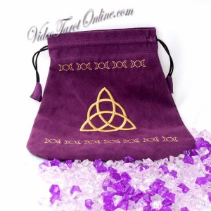 Una bolsa de terciopelo morado ricos bordados con hilo de oro de color en el diseño de triple diosa. El interior de la bolsa está llena de un satén morado a juego. Cuando usted tira de las dos cadenas en la parte superior de la bolsa de la parte superior reúne mantenimiento de sus tarjetas de seguro. Esta bolsa es adecuada para todas las tarjetas del tarot de tamaño estándar. Es decir. Rider Waite tarjetas, Mythic Tarot, etc Sharman-Caselli cubierta Estas bolsas adaptarse a todas las cartas del Tarot se venden en Holisticshop.co.uk. También son adecuados para todas las tarjetas de ángel que vendemos en el sitio en que todas las cartas de Doreen Virtue. También pueden, por supuesto, ser utilizado para otras actividades como la conservación de los objetos preciosos cristales de seguridad o de otro tipo. La Triple Diosa es el símbolo representado en esta bolsa. No es el símbolo de triple diosa lunar (tres fases de la luna), a lo largo de la línea superior y la línea de fondo, y también está el símbolo de los tres veces elíptica en el centro de la bolsa. Ambos representan la idea de la diosa triple. 20cm x 22cm x 18cm.